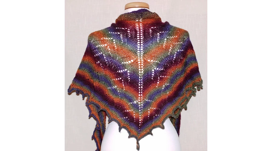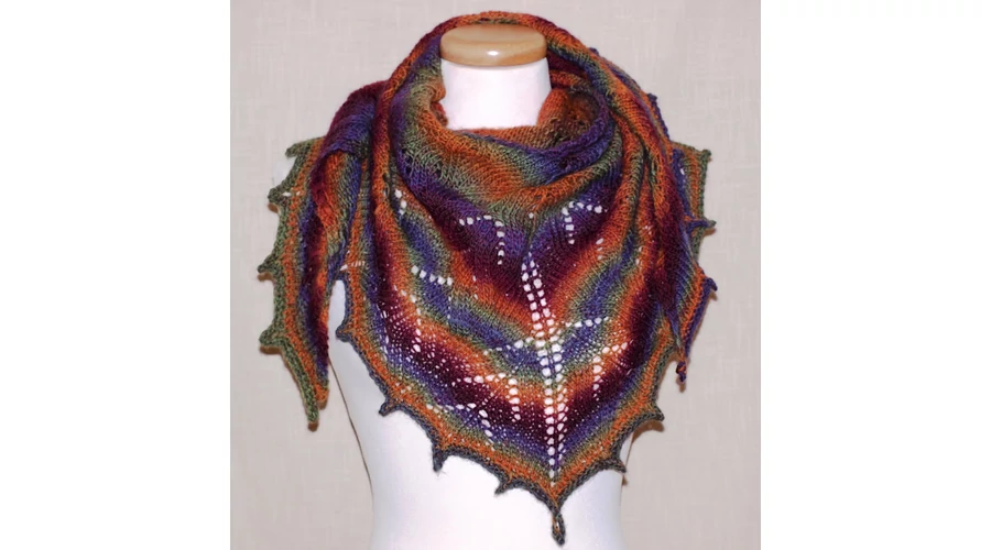 Csipkemintával  kötött,  klasszikus háromszögletű kendő, gyönyörű hosszú színátmenetes fonalból.